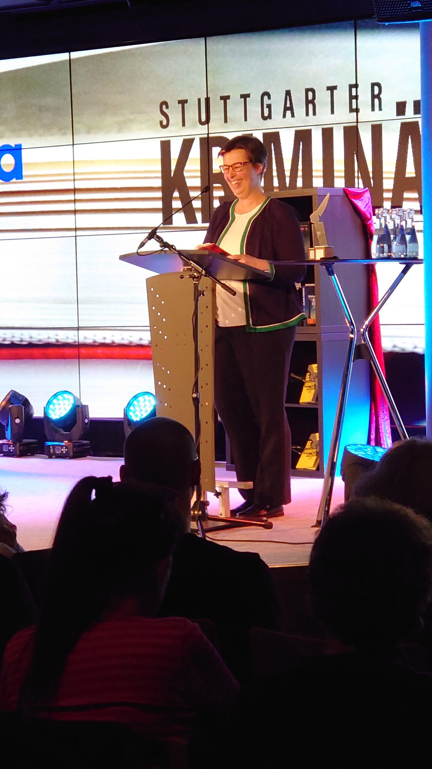 Das Kriminelle Finale mit der Verleihung der Krimipreise ist nicht nur der Abschluss, sondern für mich auch immer der Höhepunkt der Stuttgarter Kriminächte – wann sonst hat man so viele hochkarätige Krimiautor:innen auf einmal versammelt! Und außerdem finde ich es immer spannend, die Autor:innen, deren Bücher ich (fast) immer auch im Rahmen meiner Juryarbeit gelesen habe, live zu erleben und ihnen persönlich zu begegnen. In der vollständig gefüllten Halle im SpardaWelt Eventcenter moderierten Schirmherrin Astrid Fünderich und Jochen Stöckel gewohnt charmant den Abend und die Band „Inspector Noise“ sorgte wieder für die musikalische Umrahmung.