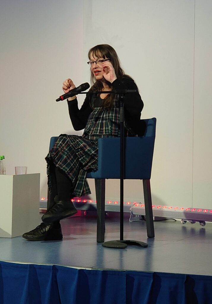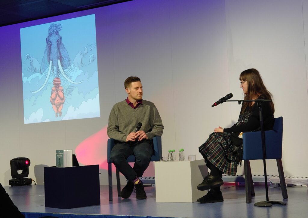 Bereits im letzten Jahr war Ulli Lust zu Gast und präsentierte den ersten Band ihres Comis „Die Frau als Mensch“, der 2025 mit dem Deutschen Sachbuchpreis ausgezeichnet wurde. Diesen Termin habe ich leider verpasst, aber als ich hörte, dass sie den zweiten Teil vorstellen würde, war ich sofort dabei. „Schamaninnen“ schaffte es auf die Shortlist des Preises der Leipziger Buchmesse und schreibt die Frühgeschichte des Menschen und die Rolle der Frau darin fort. Im Mittelpunkt steht eine Gruppe Nomad:innen und ihr Leben: Die Jagd nach Rentieren, die Geburt von Kindern und das Sterben von Alten. Und es wird gezeigt, wie die „Venus von Willendorf“ geschaffen wird, eine 29.500 Jahre alte kleine, nur 11 cm große Venusfigurine, die 1908 in Österreich entdeckt wurde. Sie zeigt eine nackte Frau mit stark ausgeprägter weiblicher Figur, allerdings ohne Gesicht. Aber ist es wirklich eine Göttin oder vielleicht doch eher das Werkzeug einer Schamanin?