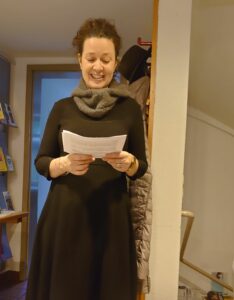Gefeiert wurde im Häusle und natürlich wurde nicht nur gefeiert, sondern auch gelesen! Zunächst begrüßte Viola Völlm die zahlreich erschienen Gäste und skizzierte ihre Vision der zukünftigen Ausrichtung des Hauses: Im Mittelpunkt soll vor allem das Schreiben stehen – nicht nur für ältere Schreibende, sondern auch für junge, angehende Autor:innen. Das Haus will ein geschützter Raum sein, in dem konkrete Textarbeit und der Austausch über geschriebenes möglich ist, gleichzeitig soll diese Arbeit bei Lesungen und Veranstaltungen aber auch in die Stadtgesellschaft hinausstrahlen.