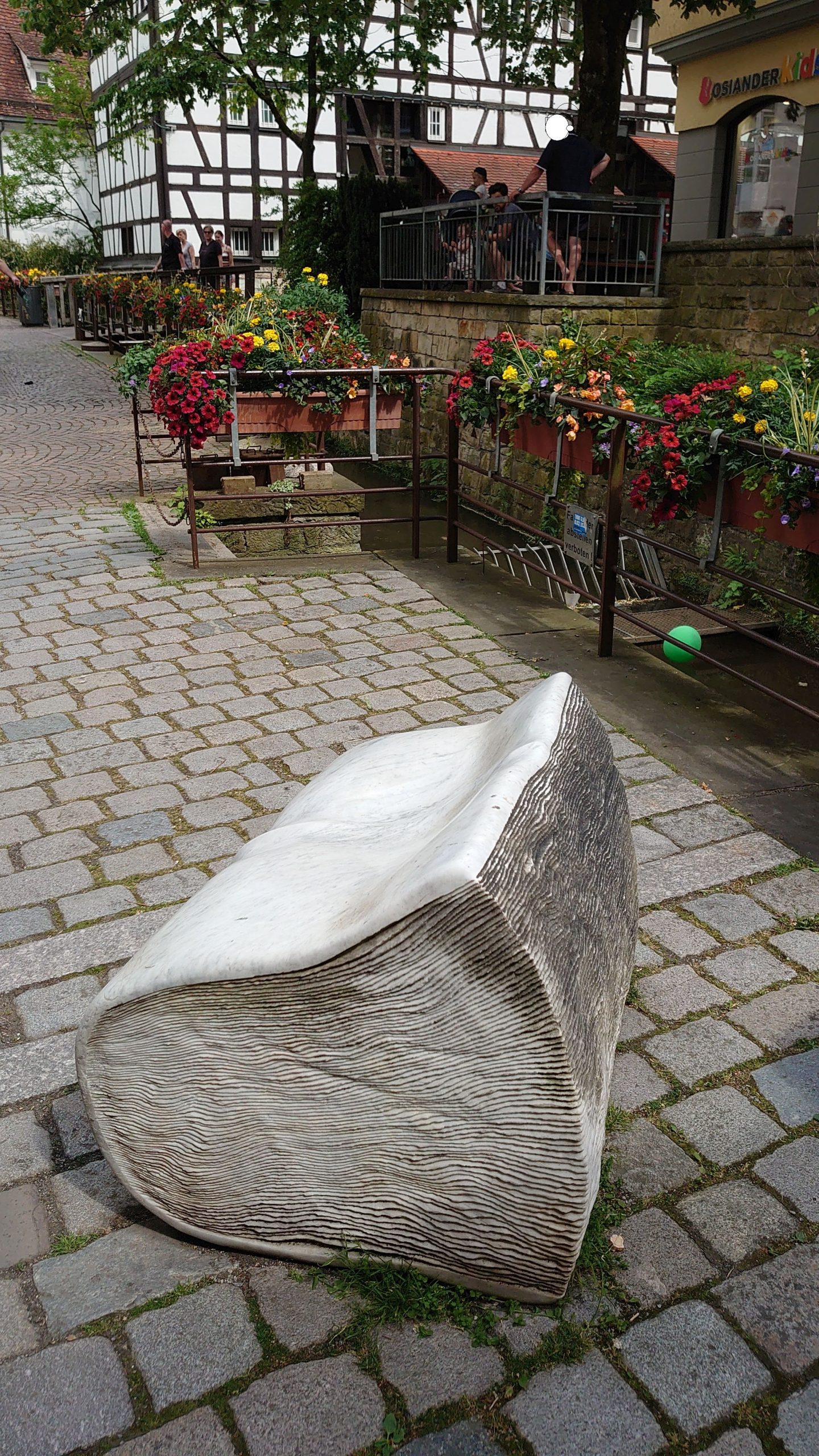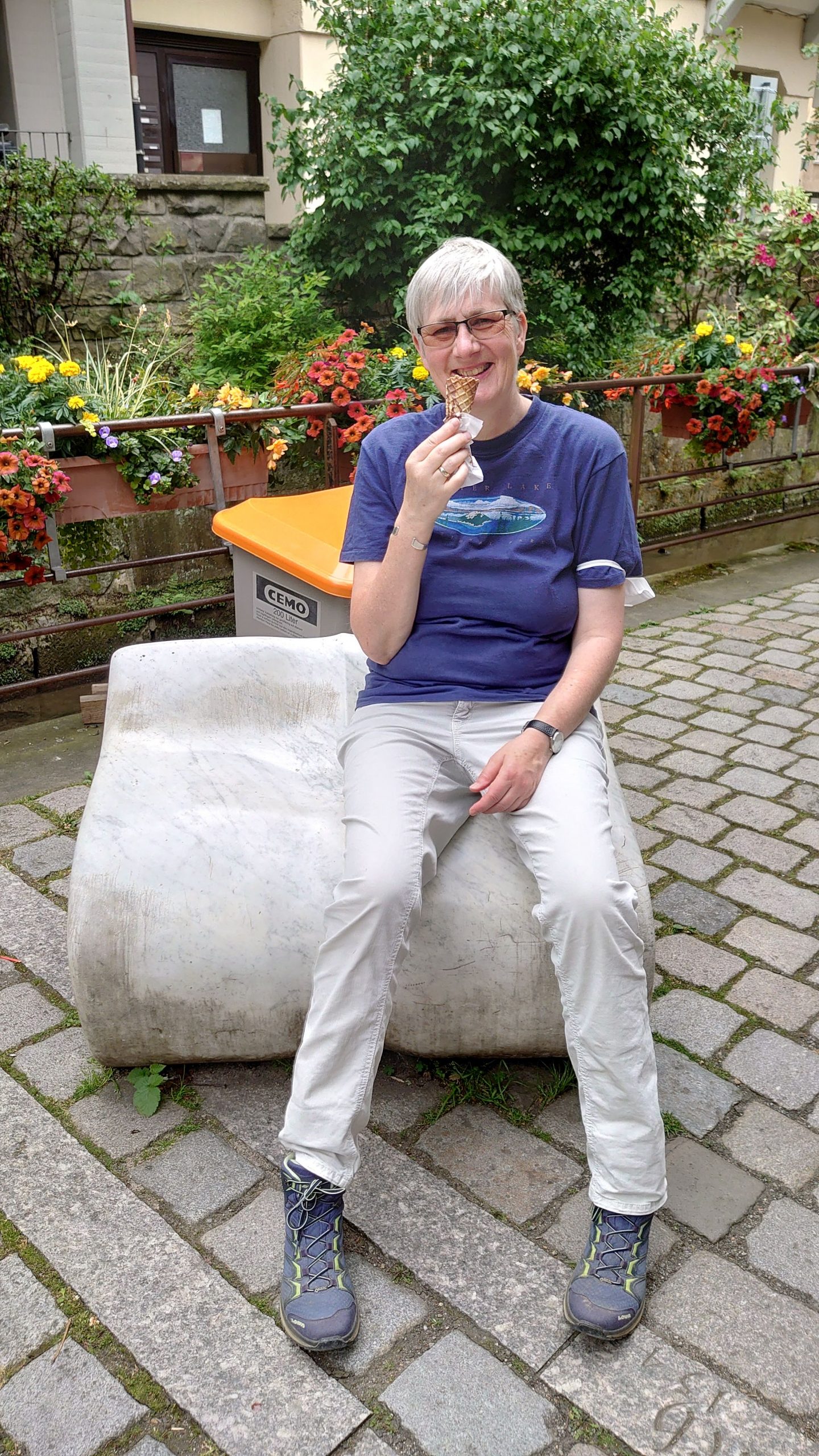Eine Eisdiele war schnell gefunden, die Schlange davor bewegte sich rasch vorwärts und das Eis am Nonnenmarkt, auf einem steinernen Buch sitzend zu schlotzen, war einfach schön.
