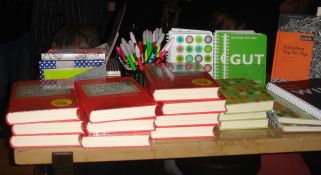 Gespannt macht ich mich also am 23. März auf ins Café Heller, bewaffnet mit den Büchern, schönen Einschreibbüchern und natürlich Mikrophon, Mischpult und Lautsprecher. Eingeladen worden war ganz zeitgemäß ausschließlich über die sozialen Netzwerke und die Onlineausgabe der Stuttgarter Zeitung. Und knapp 70 Leute folgten dieser Einladung. Dicht gedrängt saßen sie im Café und lauschten den Vortragenden Nadine, Karin, Vanessa und Milena, die aus ihren Tagebüchern vorlasen und denen man ansah, daß sie viel erfahren haben. Immer wieder brandete Gelächter auf, wenn die Damen über ihre Sehnsucht nach dem toll aussehenden jungen Mann beschreiben, dessen Namen sie leider nicht wissen, wenn sie sich freuen, endlich einen Freund zu haben, die große Liebe aber nach 3 Tagen schon wieder zu Ende ist oder sich über die engstirnigen Eltern aufregen, die so gar nichts raffen.