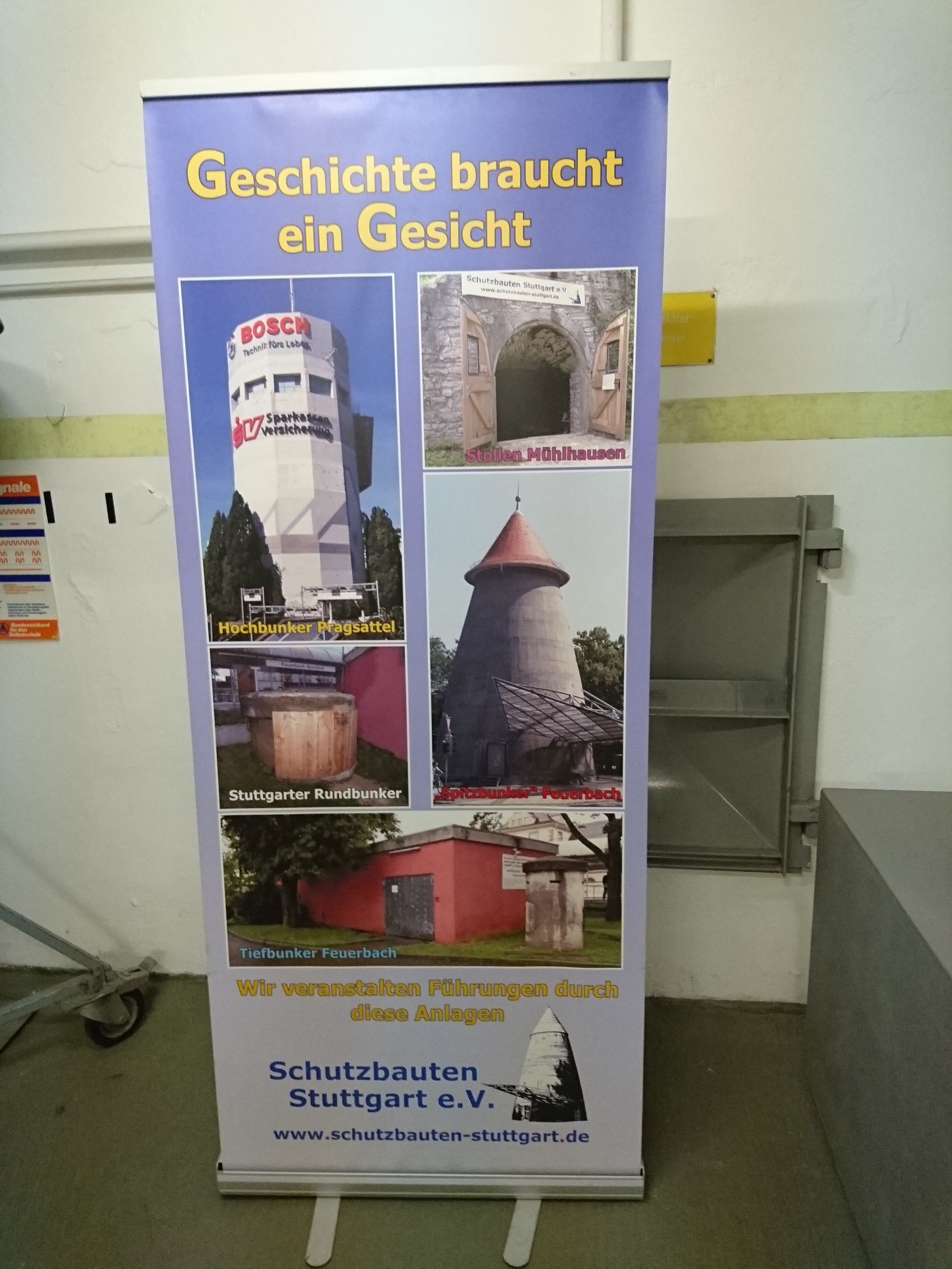 Den Abschluss dieser kleinen Lesereihe bildete dann eine Veranstaltung im Tiefbunker Feuerbach. Nachdem wir uns zunächst zum Hochbunker verirrt hatten, stiegen wir tief hinab unter die Erde. Unter der 1,70 m dicken Decke, zwischen den 1,60 m dicken Wänden lauschten wir gebannt der Lesung. Wolfgang Tischer las aus den Aufzeichnungen von Oskar Meyer, Lilian Wilfart aus den Briefen von Margots Mutter. Manch einer im Publikum war sicher froh, daß das Rumpeln, das durch die Decke drang nur von der Strassenbahn und nicht von Tieffliegern herrührte. Die Enge und Stickigkeit des Raums machte das, was die Menschen in den Bombennächten erlebten, plastisch. Aber auch das Schicksal von Oskar Meyer und seiner Familie entfaltete in dieser Umgebung eine besondere Wucht und so mancher im Publikum hatte am Ende dieser eindrücklichen Lesung Tränen in den Augen.