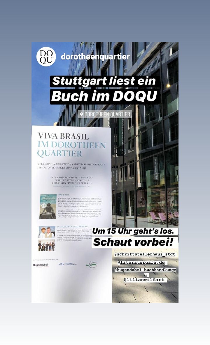 Den „Nebenhandlungen“ aus dem Roman widmeten sich 3 Veranstaltungen mit dem Sprecherduo Lilian Wilfart und Wolfgang Tischer: Während auf dem Schlossplatz die Abschlusskundgebung der Großdemonstration für den Klimaschutz stattfand, erklangen im Dorotheenquartier brasilianische Klänge und das zahlreich erschienene Publikum lauschte der Geschichte des Brasilianers.