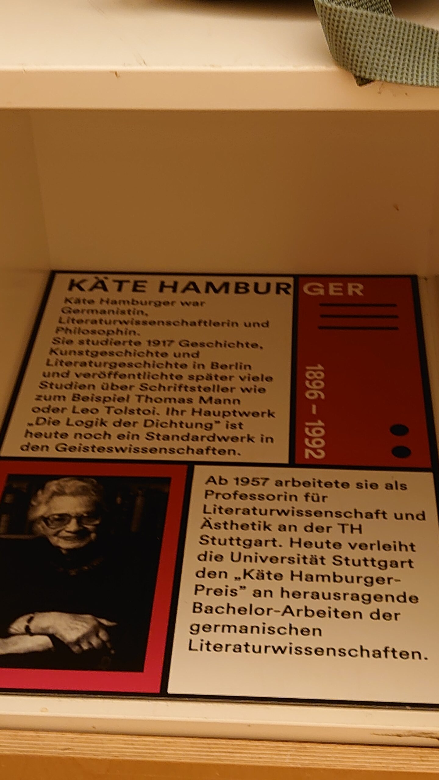 Kürzlich besuchte ich eine Ausstellung im Stadtpalais Stuttgart. Und weil ich immer mehrere Dinge miteinander verbinde, wenn ich hinunter in die Stadt fahre, war ich schon etwas bepackt, als ich dort ankam. Die freundliche Empfangsdame verwies mich an die Schließfächer im Zwischengeschoss, in denen ich mein Gepäck einschließen solle. Ganz unachtsam öffnete ich ein Schließfach und stutzte erstmal ganz erstaunt: Der Boden des Fachs war ausgelegt mit einem Text und Bild der in Stuttgart lebenden und lehrenden Germanistin, Philosophin und Literaturwissenschaftlerin Käthe Hamburger. Sofort schossen mir Erinnerungen an meine Lehrzeit in den 70er Jahren bei Weise’s Hofbuchhandlung durch den Kopf – dort war Frau Professor Hamburger eine gute und gern gesehene Kundin (die wir als Auszubildende natürlich nur im äußersten Notfall bedienen durften).