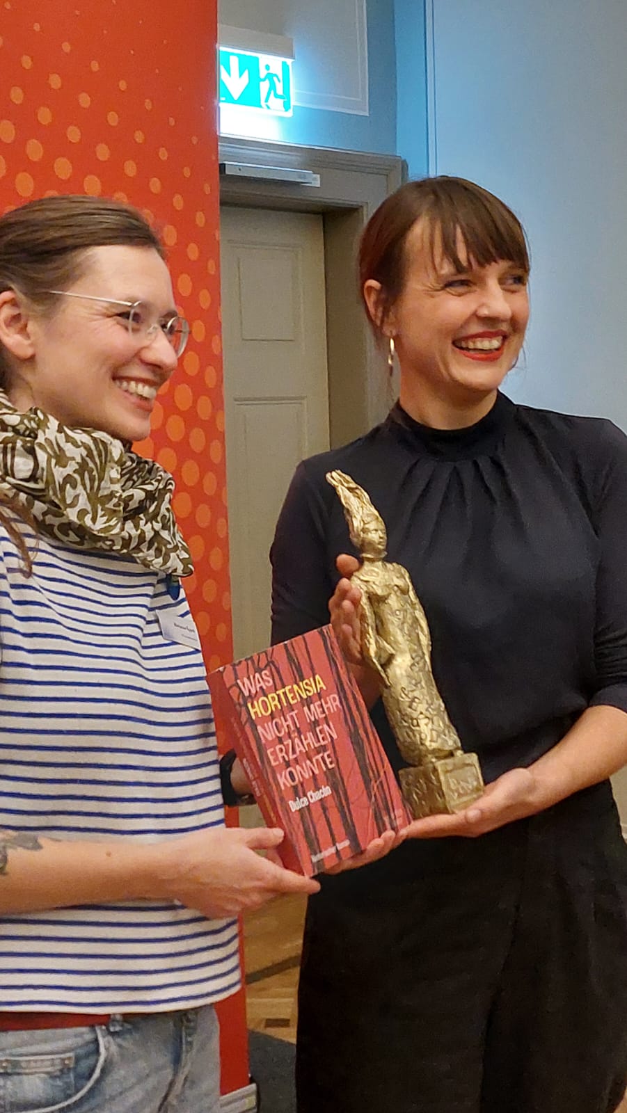 Am Abend gab es dann ein echtes Highlight: Zum 3. Mal wurde die Christine, der BücherFrauenliteraturpreis, den das Netzwerk alle 3 Jahre vergibt, feierlich verliehen. Ausgezeichnet wurde der Roman „Was Hortensia nicht mehr erzählen konnte“ der spanischen Autorin Dulce Chacón. Damit erhielt zum ersten Mal eine Übersetzung diesen einzigen deutschen Literaturpreis, der ausschließlich Autorinnen gewidmet ist.